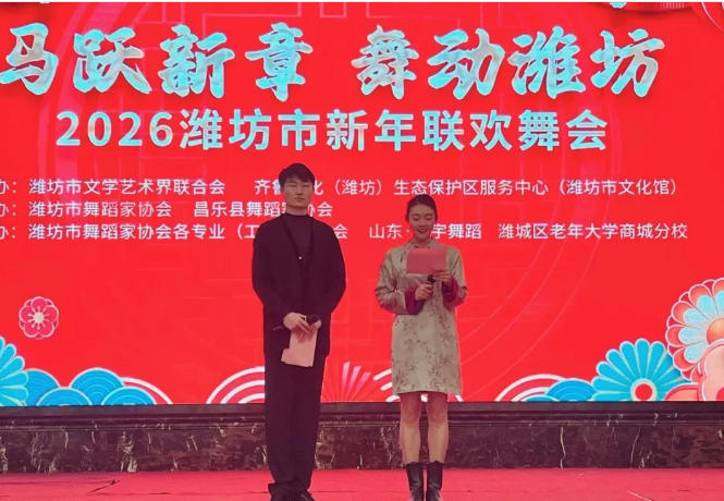 由潍坊市文学艺术界联合会、齐鲁文化(潍坊)生态保护区服务中心(潍坊市文化馆)主办,潍坊市舞蹈家协会、昌乐县舞蹈家协会承办,潍坊市舞蹈家协会各专业(工作)委员会、山东·赛宇舞蹈、潍城区老年大学商城分校协办的“马跃新章 舞动潍坊”——2026年潍坊市新年联欢舞会,于近日在潍坊市君豪国际大酒店宴会厅成功举办。新元肇启,万象更新。在辞旧迎新的欢乐氛围中,特邀嘉宾及舞蹈爱好者欢聚一堂,以舞为媒,共庆新春,我公司客户——星光舞蹈韩老师受邀出席并主持联欢晚会。